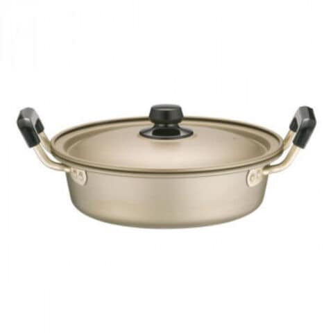 光沢のある金色が美しい硬質アルミ製の浅型両手鍋です。昔ながらの調理器具で、魚の煮付けや煮物が美しく仕上がり、家庭から業務用、防災用まで幅広く活用されます。