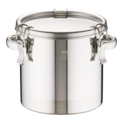 | 本体とフタの締め付けをキャッチクリップで行う密閉式容器です。内外面バフ研磨仕上げです。シリコンゴムパッキンを使用しています。底面フラットタイプのため粉・液だまりがありません。 ※密閉式容器の為、温かい物を入れるとフタが開かなくなる場合があります。 |