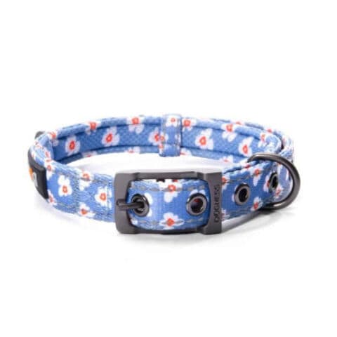 水色地に白とオレンジの花柄模様の犬用首輪です。緻密に織られた強力なテトロン(ポリエステル系合成繊維)のベルトを採用しているので、強い引張力に耐えられます。ベルトに反射材ステッチが付いていて、夜間も安心です。ベルトの留め具は高耐久・超軽量で首に負担がかかりません。首に当たる部分にはメッシュパッドを採用し、呼吸を妨げず、ソフトな着け心地です。