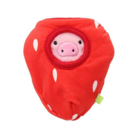 手のひらサイズのキュートなブタさんを、イチゴの形をした本体から出し入れできるおもちゃです。柔らかいおもちゃが大好きなワンちゃんにおすすめです。ぬいぐるみと本体はゴムで繋がっています。本体にはカサカサ鳴る素材、ぬいぐるみにはスクウィーカーが入っていて、音でも楽しめるおもちゃになっています。おやつを隠すこともできるので、いろいろな遊び方ができます。