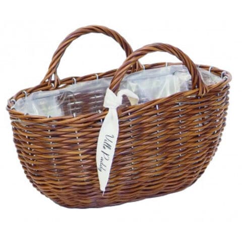 | 持ち手付きのラタンバスケットです。内側にビニールが付いているので観葉植物の土で汚れたり水で濡れたりすることを防ぐことができます。造花やドライフラワーなどのお花を入れてフラワーアレンジメントにも◎ |