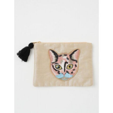 | 光沢のあるポリエステル生地に猫のモチーフが刺繍されたポーチです。フェイスラインにはビーズがあしらわれています。リップなどの化粧品や、スマホの充電器やケーブルなどのガジェットを収納するのにぴったりのサイズです。中には仕切りがあるので、アイテムが探しやすいです。 ※サイズは個体により前後します。 |