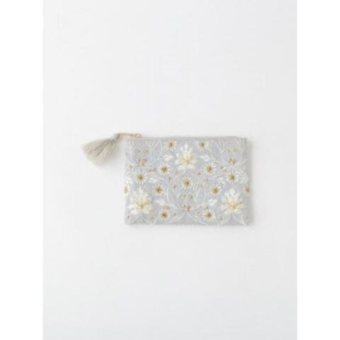 光沢のあるポリエステル生地に花柄のモチーフをビーズと機械刺繍で表現したポーチです。リップや携帯用ハンドクリームなどの化粧品や、スマホの充電器やケーブルなどのガジェットを収納するのにぴったりのサイズです。内布はコットン製になります。