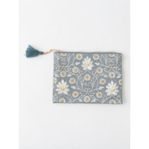 光沢のあるポリエステル生地に花柄のモチーフをビーズと機械刺繍で表現したポーチです。リップや携帯用ハンドクリームなどの化粧品や、スマホの充電器やケーブルなどのガジェットを収納するのにぴったりのサイズです。内布はコットン製になります。
