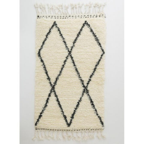 | ベニワレンはモロッコ北部の村で女性の職人によって一つ一つ織られています。ウール100%で織られており、羊毛本来のナチュラルな色味とふかふかの毛足の長さが特徴です。格子状やひし形の模様が多く用いられており、その模様には」家を守る」という想いが込められているそうです。通常は大きいサイズのものが多いベニワレンですが、今回は日本のお部屋でも使いやすい小さめサイズを特別に作っていただきました。 ※生地の取り都合上、柄に個体差があります。 ※こちらの商品はフリンジの仕様が商品によって異なります。画像参照ください。 |