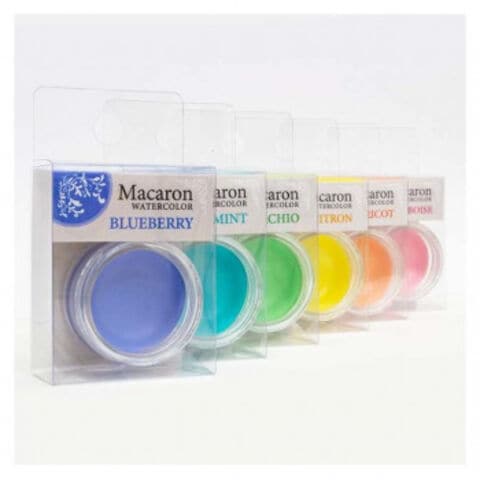 | まるでお菓子の「マカロン」のような色合いの固形水彩絵具。水をふくませた筆で色の表面をなでれば、かわいい色が溶けて広がります。6色セット。 |