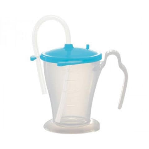 | ベッド柵にも手にもぴったりフィットする、こぼしにくいストローカップ。 |