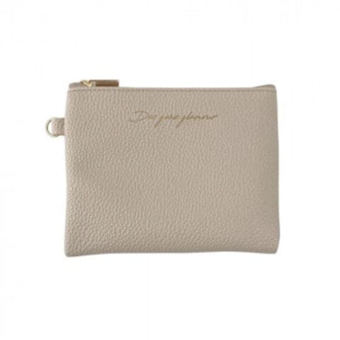 | 上品なシボ感のある合皮生地に英字箔押しロゴをプリントしました。miniサイズだから、ちいさめBAGにも入ります。背面にはティッシュケース付き。リップや手鏡など小物収納におすすめです。側面にはDカン付き。 |