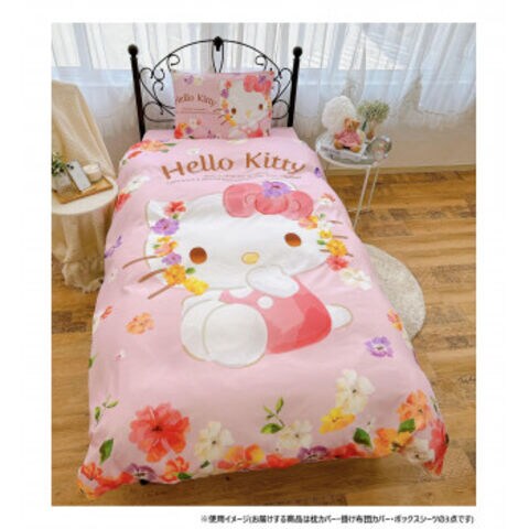 水彩タッチのキティが大人かわいい布団カバー3点セット。カラフルなお花が寝室を華やかに演出。ピーチスキン加工で柔らかな肌触り。
