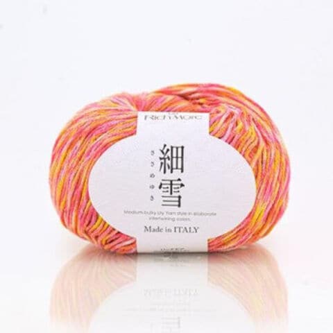 | 外側のゲージの甘いリリヤーン越しに内側のゲージの詰まったリリヤーンが見え、スパイラル形状も加わり、複雑な色ミックス効果が編み地に現れます。空洞化したリリヤーン構造により、軽い作品を編み上げることができます。色はアンティーク着物の配色をイメージしたプリント染めです。 ※お色はできるだけ商品に近づけるよう表現しておりますが、閲覧環境により実際の色と異なる場合がございますので予めご了承下さい。 |