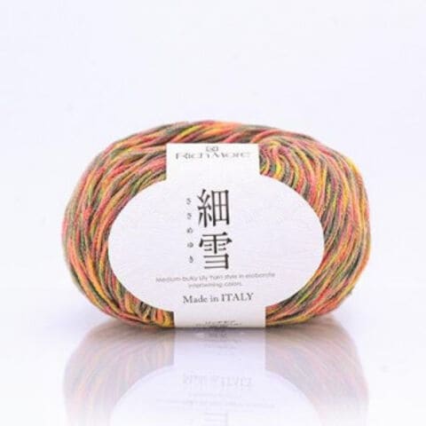 | 外側のゲージの甘いリリヤーン越しに内側のゲージの詰まったリリヤーンが見え、スパイラル形状も加わり、複雑な色ミックス効果が編み地に現れます。空洞化したリリヤーン構造により、軽い作品を編み上げることができます。色はアンティーク着物の配色をイメージしたプリント染めです。 ※お色はできるだけ商品に近づけるよう表現しておりますが、閲覧環境により実際の色と異なる場合がございますので予めご了承下さい。 |