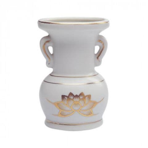 | 毎日ご先祖様に使う仏具・仏器は使いやすさ、シンプルさにこだわりました。白磁に金の蓮をあしらった、定番デザインの陶器製花立て。 |
