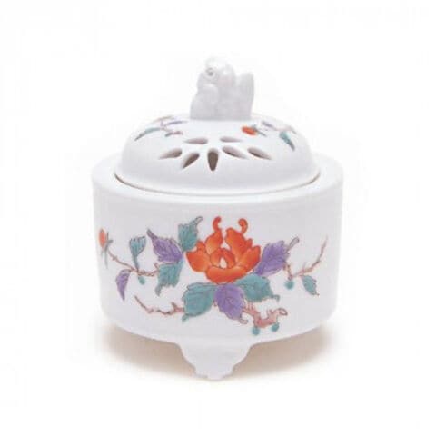 | 白磁に色絵の鮮やかさが映え、有田焼の代表的様式美として見る人を魅了します。 (ご使用方法) 香炉の八分目ほどまで香炉灰をいれます。お香の先端に火をつけ、炎を消し、くゆらせます。灰の上に置いて、フタを閉めずにたいてください。フタを閉めてたきますと、酸欠となり、お香が途中で消える場合があります。小さな香炉の場合、スティック型は灰の上に立ててたいてください。たいていない間はフタを閉め、置物・インテリアなどとしてお楽しみください。 |
