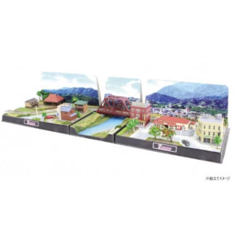 | セット内容 | ミニレイアウト本体(郊外・川・駅前)×各1個 直線レール55mm×3本 エンドレール×1本 直線レール25mm×4本 曲線レールR127-26度×4本 道床なし直線レール110mm×1本 トタン屋根農家×1個 トタン屋根納屋×1個 二階建住宅C×1個 角店B×1個 商店A×1個 商業ビルC×1個 乗用車×4台 踏切(日本型)×2本 駅舎×1個 柵:(茶)×3本、(白)×1本 常緑樹×36本 人形×5体 街路灯×8本 ガードレール(長・短)×各4本 ディスプレイカバー:(大)×2個、(小)×1個 単線トラス鉄橋(短)110mm赤×1本 ロゴシール×2枚 センサーケーブル用延長ケーブル×1本 フォーリッジ×2種 バラスト×2種 パウダー類×7種 取扱説明書×1枚 |