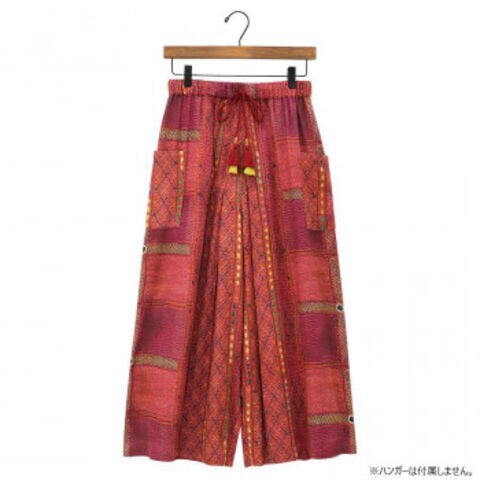 | バンジャラ族の美しい刺繍布をデジタルプリントで表した、見た目に華やかなアイテムです。鮮やかなカラーがシンプルなトップスに合います。ウエストは紐で調節可能です。両ポケット付き。 |