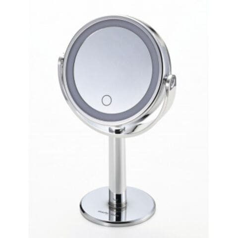 | 鏡の部分は使いやすい角度に調節できます。ミラー周りにLEDが埋め込まれており、明るく照らしてメイクができます。タッチセンサーで転倒します。裏面は3倍の拡大鏡担っています。点灯後、センサーを長押しすることで明るさを調整することができます。 |