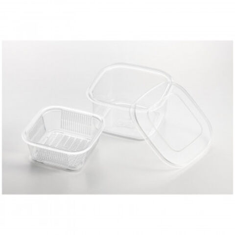 | ガラスのように透明度が高く、中身が分かりやすい角型容器。軽くて丈夫なので、扱いやすく、変色や油汚れにも強い。下ごしらえから調理、保存までこなせます。ザル付きなので、水切りしてそのまま電子レンジにも。冷蔵庫内のスペースを有効に使える角型。 |