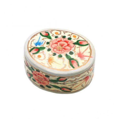 | インド、カシミール地方の伝統的な紙細工「ペーパーマッシュ」アイテム。紙と紙粘土で形を作り、手描きで素敵な柄を描いています。可愛い小さなサイズのボックスです。色違いで揃えたり、ピアスやリングなど小さなアクセサリーを収納するのにピッタリ。 ※職人さんの手作りのため形や絵柄、色合いにばらつきがございます。 |