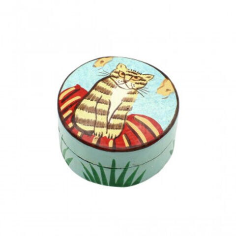 | インド、カシミール地方の伝統的な紙細工「ペーパーマッシュ」アイテム。紙と紙粘土で形を作り、手描きで素敵な柄を描いています。ネコの日常の様子が描かれた小さなサイズのボックスです。色違いで揃えたり、ピアスやリングなど小さなアクセサリーを収納するのにピッタリ。 ※職人さんの手作りのため形や絵柄、色合いにばらつきがございます。 |