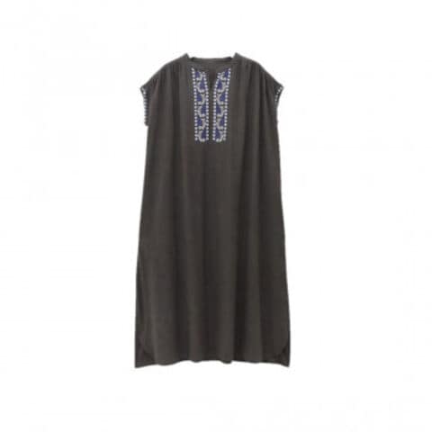 | とても細かなクロス状の刺繍が美しいワンピースです。胸元と袖口に刺繍が入っているのがポイント。コットンスラブで夏でもさらりと着られます。 |