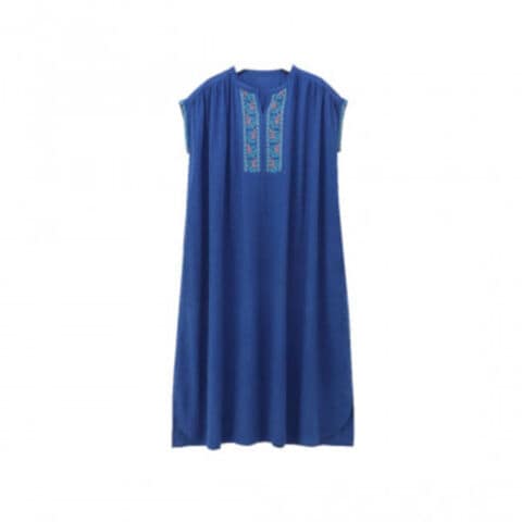 | とても細かなクロス状の刺繍が美しいワンピースです。胸元と袖口に刺繍が入っているのがポイント。コットンスラブで夏でもさらりと着られます。 |