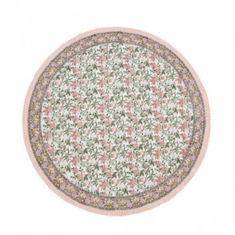 「カリーノ」は「かわいらしい」という意味。心ときめく配色と素朴な花柄が毎日を彩ります。「ブロックプリント」でデザインされた、ボタニカル柄のラウンドクロス。テーブルに敷けば華やかなデザインで食卓をぱっと明るくします。「ブロックプリント」は木版を使って、職人がひと版ひと版、手でスタンプを押すように生地の上にプリントするインドの伝統的な技法です。