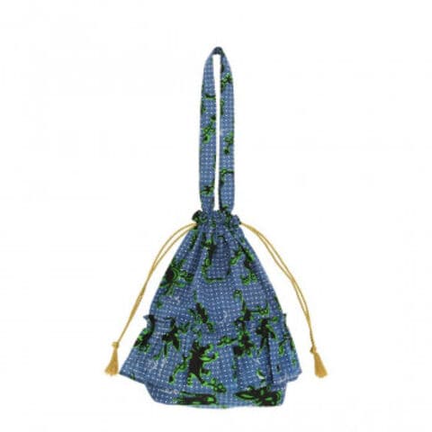 スカートのようなフリルが可愛い巾着バッグ。アフリカンプリントの魅力的な柄を絞って可愛く持ち運べるバッグです。マチがあるので物が入れやすく、絞ってもそのままでも。