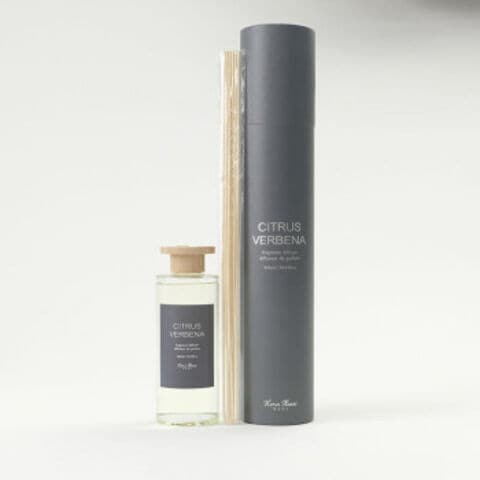 ガラス瓶にナチュラルなWOOD素材の蓋が付いたリードディフューザーです。しっかりした筒型のBOXに入っているので、ギフトにもピッタリ。フレッシュで爽快感のあるヴァーベナの香りにフルーティなレモンやグレープフルーツが漂う香りです。