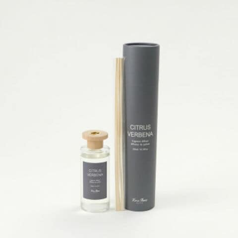 ガラス瓶にナチュラルなWOOD素材の蓋が付いたリードディフューザーです。しっかりした筒型のBOXに入っているので、ギフトにもピッタリ。フレッシュで爽快感のあるヴァーベナの香りにフルーティなレモンやグレープフルーツが漂う香りです。