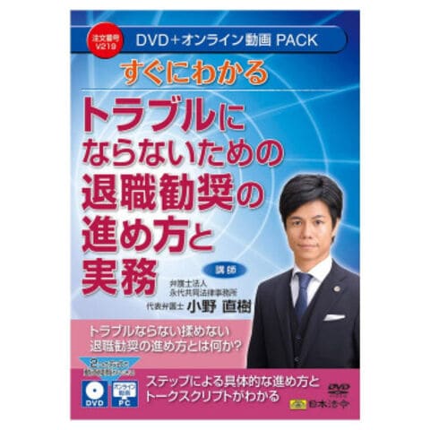 | トラブルにならない退職勧奨の進め方とその実務を、具体的に、わかりやすく解説をしています。 【注意】 ※本商品を視聴するには、(1)DVDディスクの場合はDVDビデオ対応プレーヤー、(2)オンライン動画サイトの場合はWEBブラウザが必要となります。 ※DVDをパソコンで再生する場合は、パソコンにDVDドライブ、DVD再生ソフトが搭載されている必要があります。 ※本商品(DVD及びオンライン動画サイト)には、講義テキストをPDFファイルで収録しています。ご使用のプリンタで印刷してご利用ください。詳しくは、本商品に同梱されている取扱説明書をご参照ください。 ※パソコン動作環境:パソコンの環境によって再生できない場合がございますので、その場合はパソコンメーカーへご相談ください。 ※講義テキスト(PDF)を閲覧するためにはAdobe Acrobat Readerが必要です。また、オンライン動画を閲覧するには、Microsoft Edge44以上、Google Chrome80以上、Safari12以上が必要です。 |