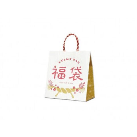 | しめ飾りを大きく配置した視認性の高い福袋です。持ち手に白と赤で編まれた紐を使用しています。 |