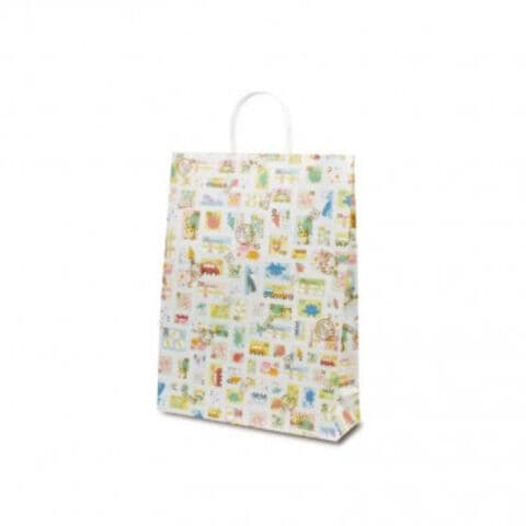 自動紐手提袋。業務向けの手提袋です。キリンやヒヨコ、車や恐竜が描かれたかわいい切手柄です。