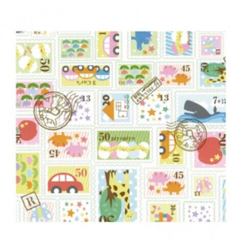 キリンやヒヨコ、車や恐竜が描かれたかわいい切手柄の包装紙です。