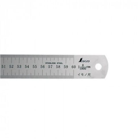 | 鋳物用の木型や金型の製作時に、型の寸法を測定する時に使用します。鋳物は砂のくぼみに溶けた鋳鉄を流し込んで固めます。この時、収縮するので型は大きめに作ります。金属や、大きさ、鋳物工場によって収縮率が異なりますので、それらに応じた拡大率のイモノ尺が必要になります。シルバー加工で表面の反射を抑え目盛が読み取りやすくなっています。 ※伸縮によってサイズや質量の数値は変わります。 |