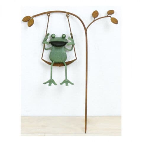 | ブランコに乗ったカエルのデザインがユニークな、ガーデンピック。 |
