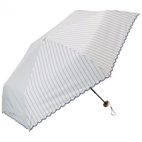 | 開くと通常サイズ、たたむとコンパクトです。UVカット率99.9%、高い遮光・遮熱性。マルシェの屋根をイメージしたパターン。細いストライプと裾の刺繍が繊細でこだわりのあるデザインです。 |