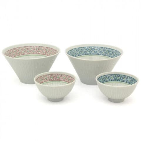 「円をつなぎ縁をつなぐ」七宝つなぎ文様。かわいらしい普段使いの器です。外側は十草模様のレリーフのみですっきりと、内側にかわいらしい花のような印象の七宝つなぎ模様を施した、モダンな大鉢とお茶碗の2色づつのセットです。贈るシーンで使いやすい赤と青の組み合わせです。普段の食卓で気楽に使っていただける、飾らない和食器です。