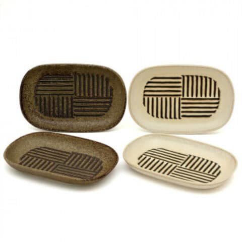 | シンプルで個性的な文様に表情のある釉薬、素朴で温かみのある楕円皿セット。味のあるタッチで表現された文様は、臼の擦り合わせ面の溝をイメージ。どこか懐かしい表情の器は温かい味わいがあり、気取らず飾らない毎日の食卓に調和します。小判形の皿は、焼き鳥などの串料理はもちろん、卵焼き、おつまみなども盛り付けやすい形。収納や洗いかごにも収まりが良く、使い勝手の良いお皿です。 ※オーブン・直火でのご使用はできません。 ※器の表情に変化をつけるため、窯の中での炎のあたり具合などで表面にムラが出やすい釉薬を使用しています。陶器の味わい、個性としてご了承いただき、お楽しみください。 |