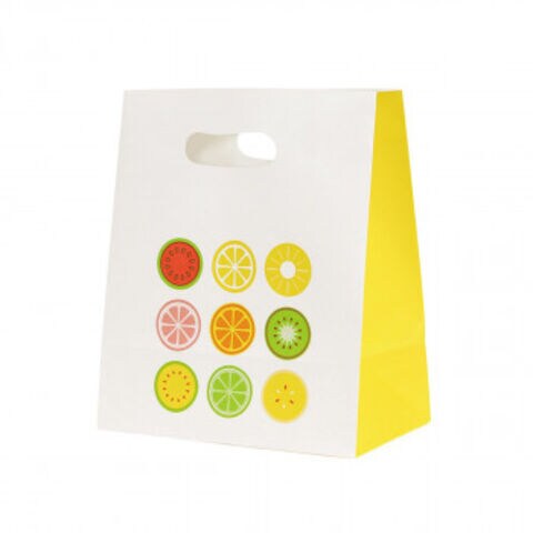 | カットフルーツがプリントされた紙袋です。雑貨の包装などさまざまなシーンで活躍すること間違いなし。 |
