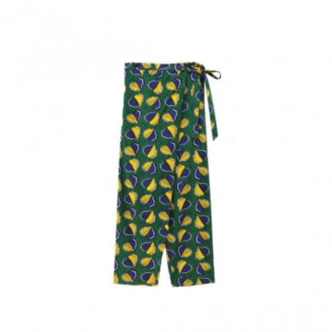 | 前がラップ風のパンツが、鮮やかなアフリカンプリントの魅力をより引き立ててくれます。カジュアルにかっこよく履いていただけるパンツです。 |