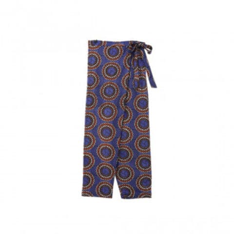 | 前がラップ風のパンツが、鮮やかなアフリカンプリントの魅力をより引き立ててくれます。カジュアルにかっこよく履いていただけるパンツです。 |