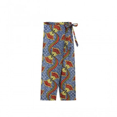 | 前がラップ風のパンツが、鮮やかなアフリカンプリントの魅力をより引き立ててくれます。カジュアルにかっこよく履いていただけるパンツです。 |