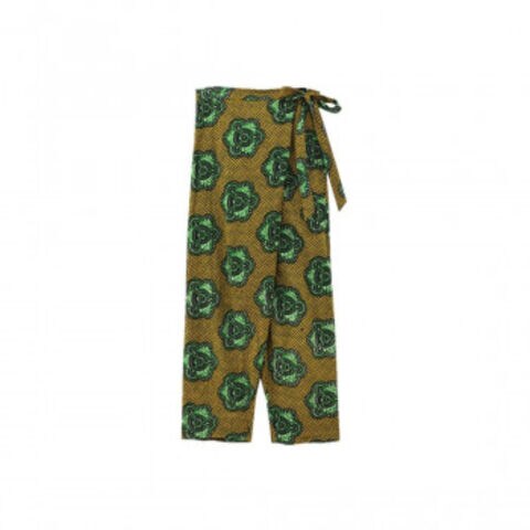 | 前がラップ風のパンツが、鮮やかなアフリカンプリントの魅力をより引き立ててくれます。カジュアルにかっこよく履いていただけるパンツです。 |