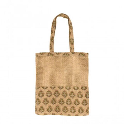 ブロックプリントジュートネットトートバッグ ブラウン×ピンクフラワー 15625750534