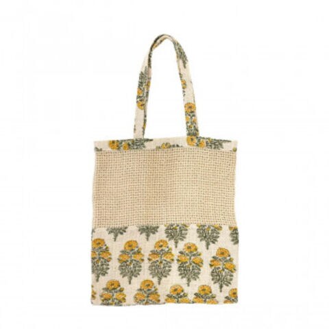 ブロックプリントジュートネットトートバッグ ホワイト×イエローフラワー 15625750537