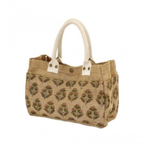 ブロックプリントジュート6ポケットバッグ ブラウン×ピンクフラワー 15625750538