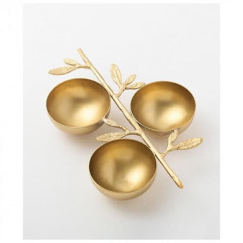 マットなゴールドが高級感のある、葉と木の枝モチーフの3連ボウルです。指輪やピアスなどのアクセサリーを見せる、ディスプレイトレーにおすすめです。