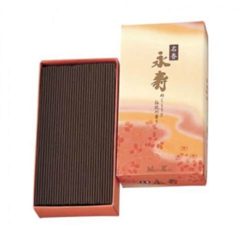 | 遙か永遠の時の流れを想い やすらぎを祈る。こんな願いを込めて名付けられた「永寿」。伝統のお線香の香調、機能を併せ持つ永寿は、お線香本来の良さにこだわったお線香です。インド産の白檀と産地厳選の上質の生薬系香料を豊富に使用。きりりとした清涼感のある深い辛みと、コクのあるまろやかな甘みがひろがる香りのお線香です。 |
