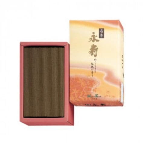 | 遙か永遠の時の流れを想い やすらぎを祈る。こんな願いを込めて名付けられた「永寿」。伝統のお線香の香調、機能を併せ持つ永寿は、お線香本来の良さにこだわったお線香です。インド産の白檀と産地厳選の上質の生薬系香料を豊富に使用。きりりとした清涼感のある深い辛みと、コクのあるまろやかな甘みがひろがる香りのお線香です。 |