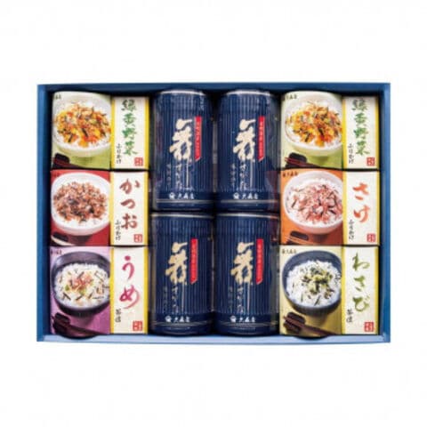 セット内容味付のり(10切32枚)4個・ふりかけ(緑黄野菜2.5g×10袋2箱・かつお・さけ各2.5g×10袋1箱)・茶漬(うめ6g×6袋・わさび5.6g×6袋各1箱)